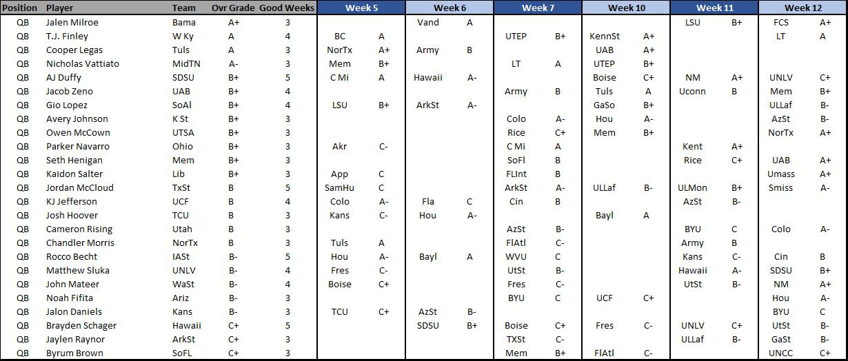 I use my own defensive power rankings to generate rush and pass defensive rankings for all FBS schools. I then grade the various favorable match-ups for the players listed here and provide a comprehensive overall grade for each player. The article below provides a tool you can use to perform your own schedule matching research.
