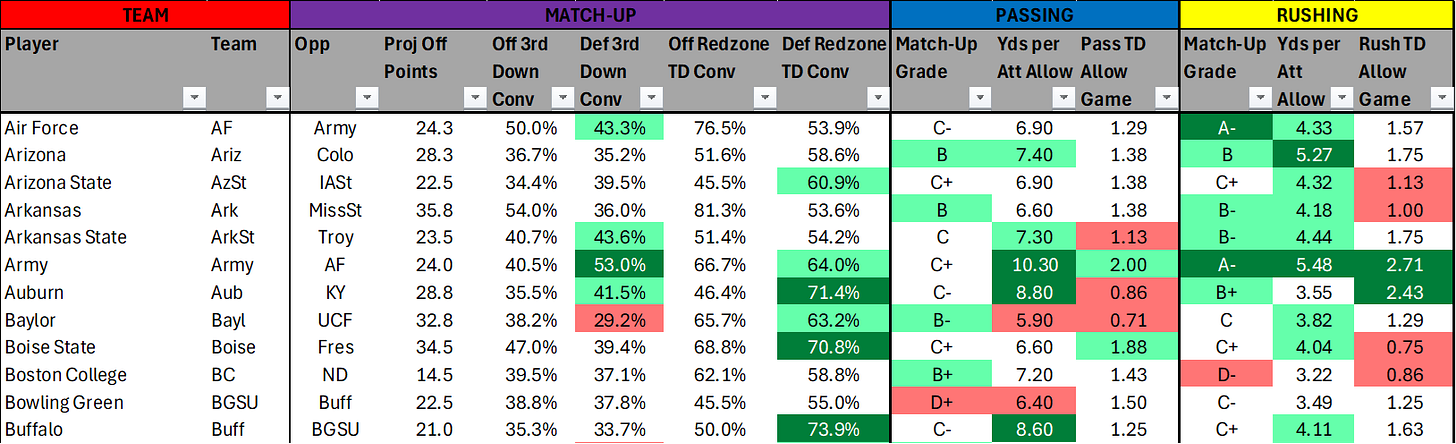 Purple Reign is now providing you with a full data set of the advanced stats that he uses each week when prepairing his player rankings and start ‘em, sit ‘em selections. This spreadsheet is exclusive to premium subscribers. Below is a sample of the spreadsheet that premium subscribers can download where they can view every team that has games this week.