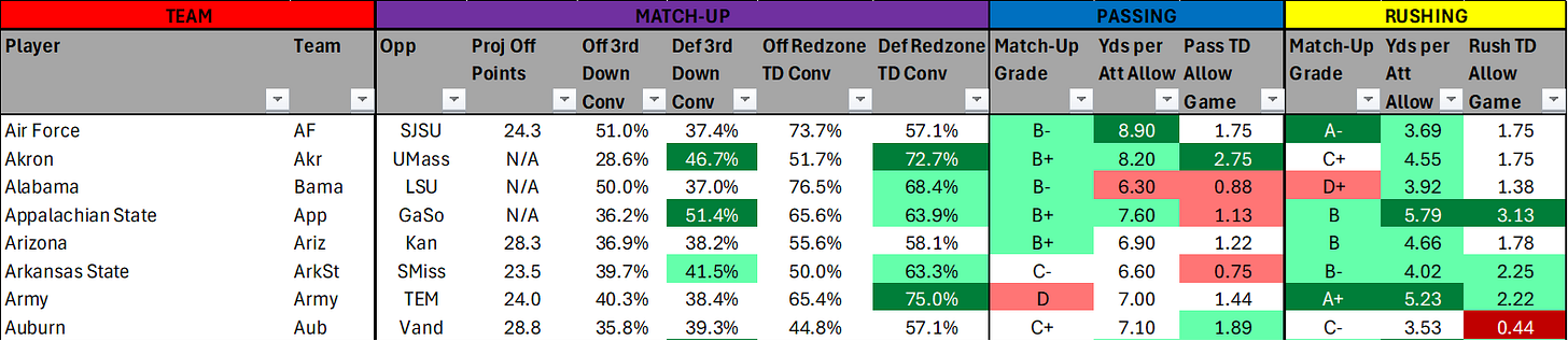 Purple Reign is now providing you with a full data set of the advanced stats that he uses each week when prepairing his player rankings and start ‘em, sit ‘em selections. This spreadsheet is exclusive to premium subscribers. Below is a sample of the spreadsheet that premium subscribers can download where they can view every team that has games this week.