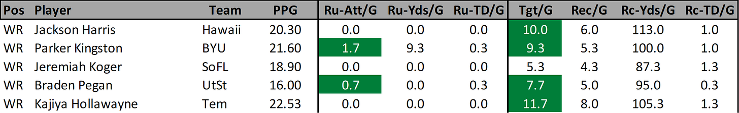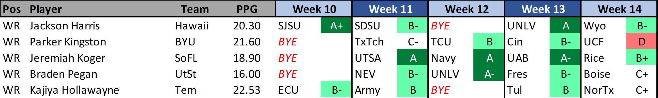 Pegan has been the brightest spot in the Utah State offense lately. Over the last four games he has scored 16+ fantasy points, been targeted 8+ times, racked up 80+ receiving yards, and scored a TD three times. I love fantasy players from the Mountain West late in the fantasy season as the match ups tend to mostly be good. That’s what I see with Pegan’s schedule, only having one match up that’s not a good one.