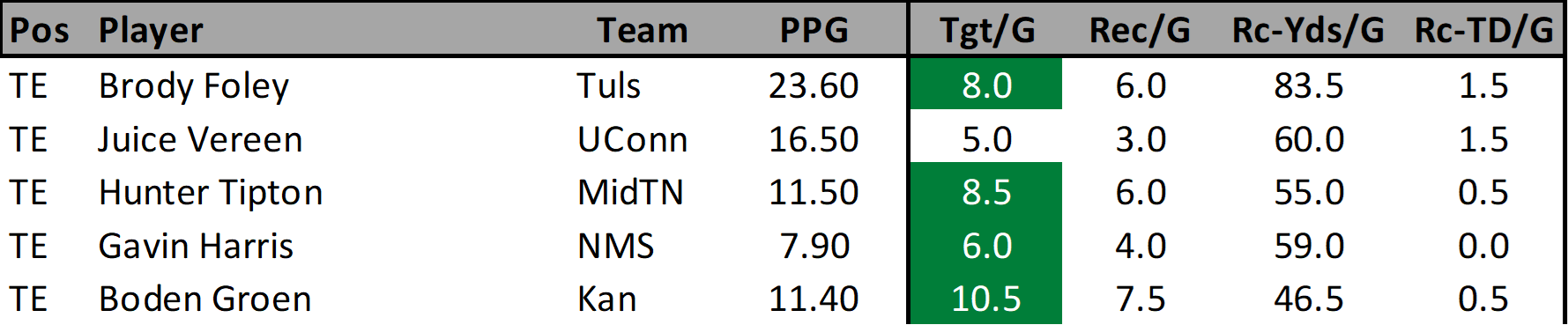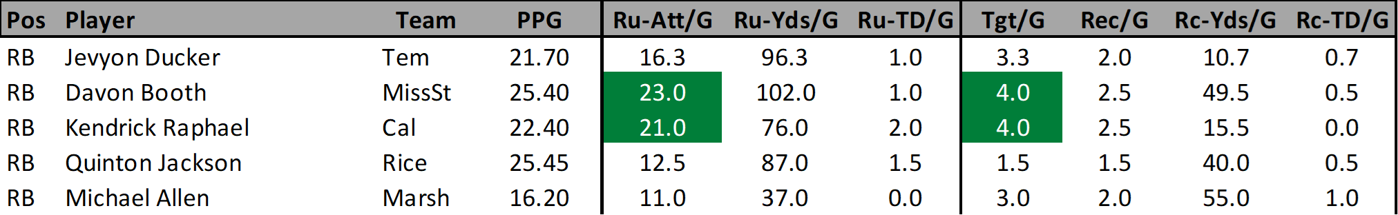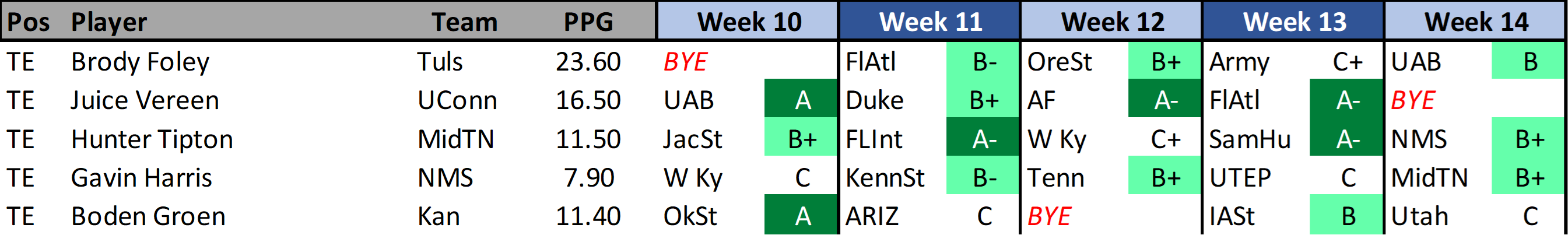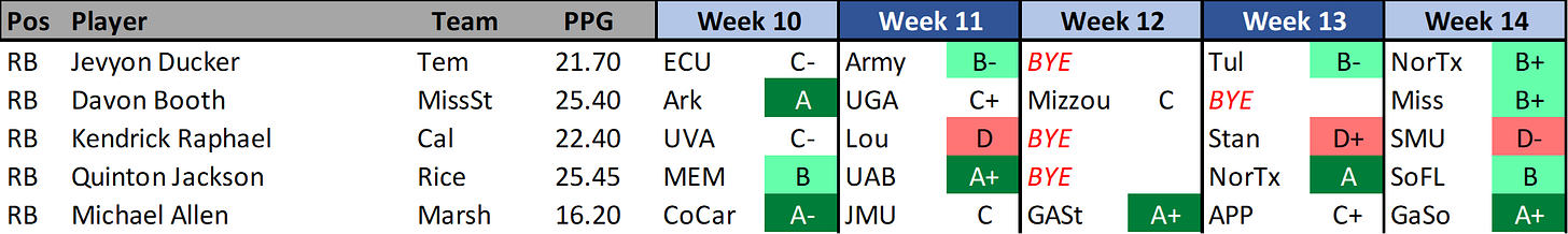 In three of Middlebrook’s last four games he has scored 15+ fantasy points, ran for 85+ yards, and received 5+ targets. He is the best PPR RB of this group, averaging 6 targets/game over the last three weeks. The biggest knock on Middlebrook is his remaining schedule where the best remaining fantasy match up grade is a C+ grade against Sam Houston State.