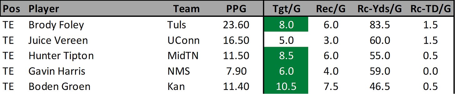 While the Middle Tennessee offense is known for giving their TEs a good sized workload, we haven’t really seen that this season. But things have been changing the last two weeks as Tipton has seen his workload increase to 11 and 6 targets. He doesn’t appear to have the highest fantasy ceiling right now but he is building a new resume of production stability right now. I see every game remaining on his schedule as one that you could potentially put him in your line up.