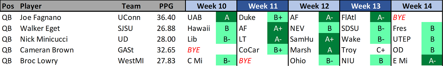 Fagnano has been rolling for three weeks now, putting up 34.15, 42.6, & 30.2 fantasy points. The offense is clicking with him right now and his remaining schedule looks great with four fantasy match ups that range from A to B+ grades. So Fagnano is not only a guy that can push your team into the playoffs, but he can also push you into the championship round.