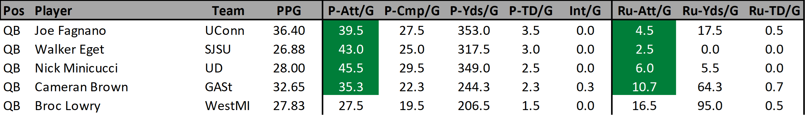 I felt like Groen should have had a decent day last week but Kansas State held him in check, as he only scored 2.7 fantasy points. Outside of that game he’s been pretty reliable for at least 7 fantasy points since he became the starter. I’m going to keep hanging my hat on that observation and continue to recommend him.