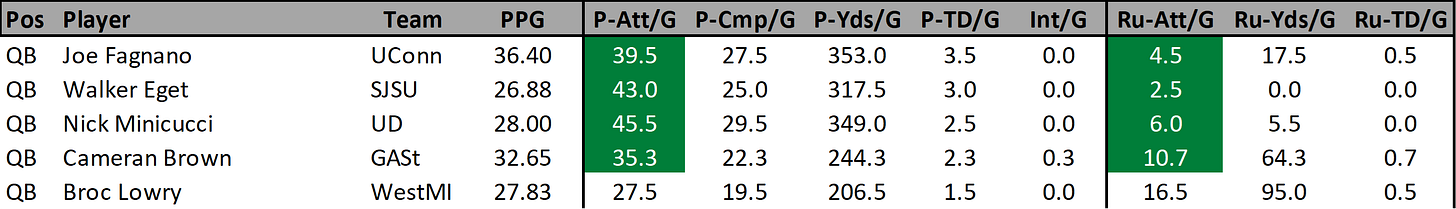 The coaches were wise to make the switch to Brown at QB. In his three starts this season he has score 27.2, 36, & 34.75 fantasy points. He is a dual threat QB and over the last two games he’s totaled 25 carries for 187 yards and 1 TD on the ground. From a fantasy production standpoint he’s been better than Eget and Minicucci but his schedule isn’t as good as those two. The scheduling discrepancy is the sole reason those two are ranked ahead of him this week.