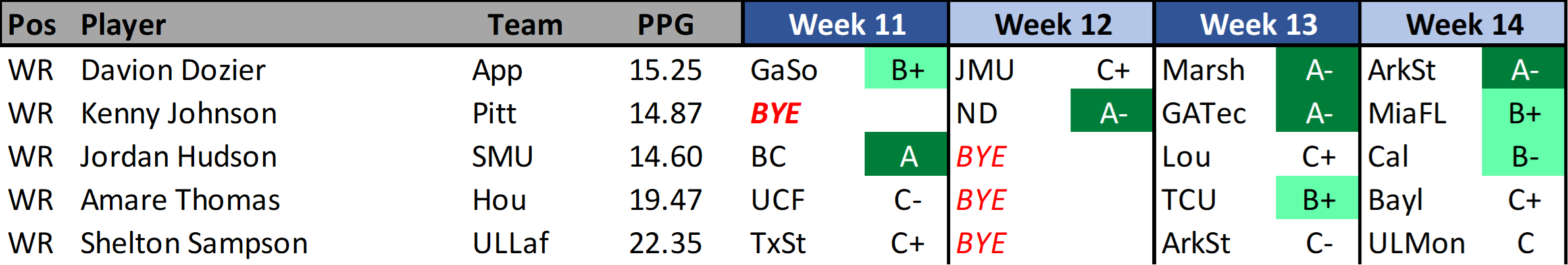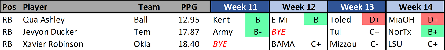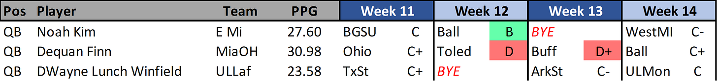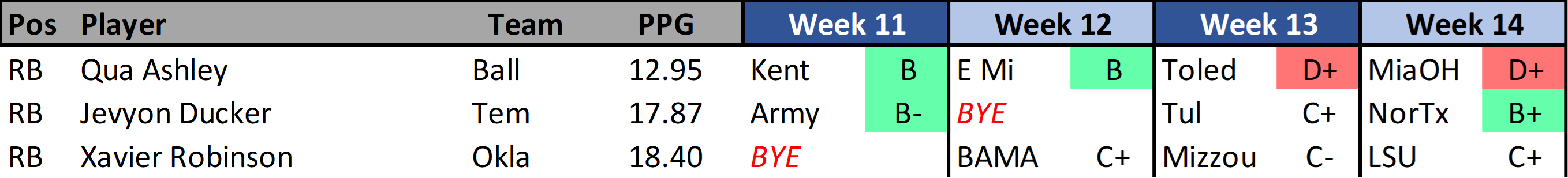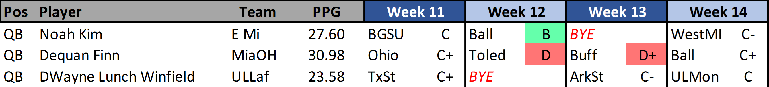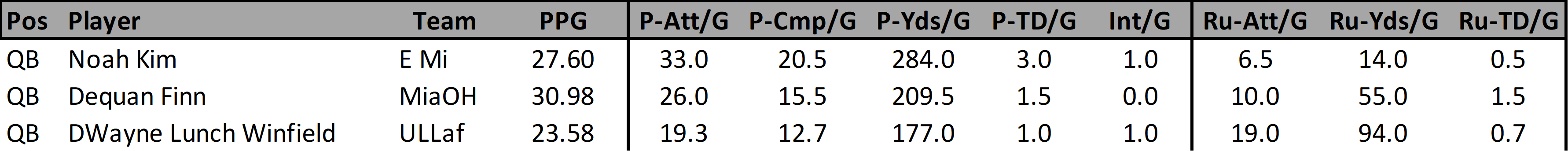 Kim is coming off of a bye week. He has put together two decent performances the last two games against some of the better teams in the MAC (Miami, OH and Ohio). He scored 27.25 and 27.95 fantasy points in those two contests while averaging 3.5 total TDs/game. The fact he put up that many fantasy points in games with bad fantasy match up grades means he may have more value than his upcoming schedule match ups show.