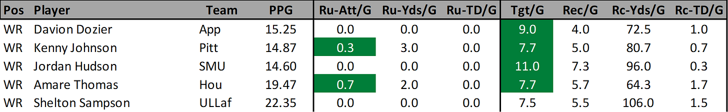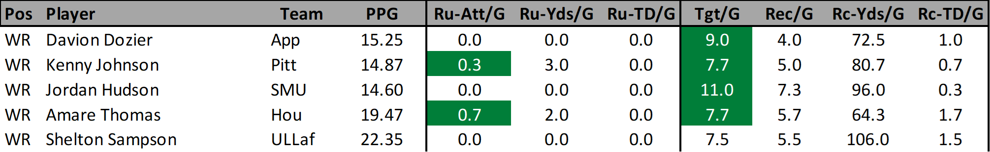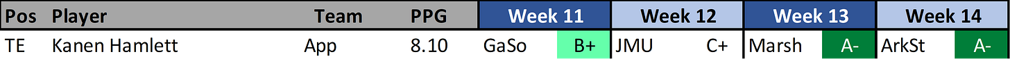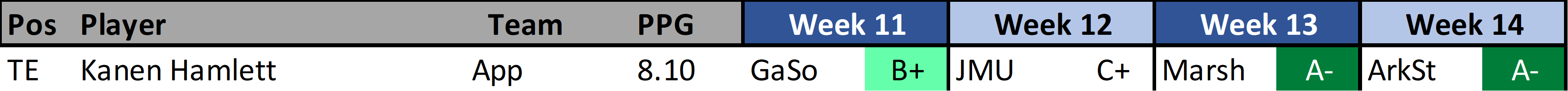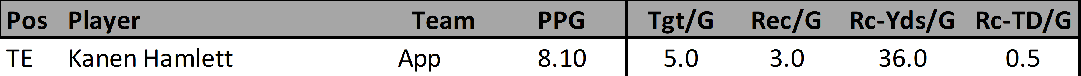 Hamlett is coming off of a bye week. With starting TE Izayah Cummings lost for the season Hamlett stepped up and had 10 targets for 6 receptions, 72 yards and 1 TD in his only game as the starter (16.2 fantasy points). Due to the small sample size we have for him I held back from making him a Top 5 pick this week despite the great remaining schedule he has.