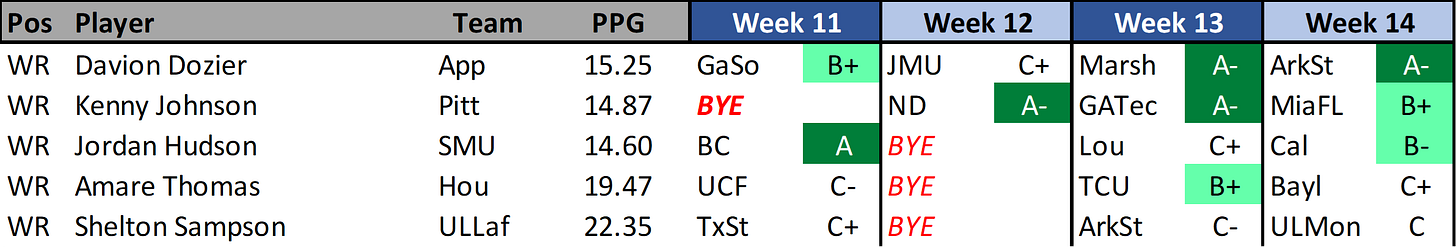 After getting injured in September Sampson has return for two games now and scored 15.9 and 28.8 fantasy points. His production is the best of this group of WRs but his remaining schedule is the worst of this group as well. While this week’s fantasy match up grade is a C+ I think he could be still useful in your line up.