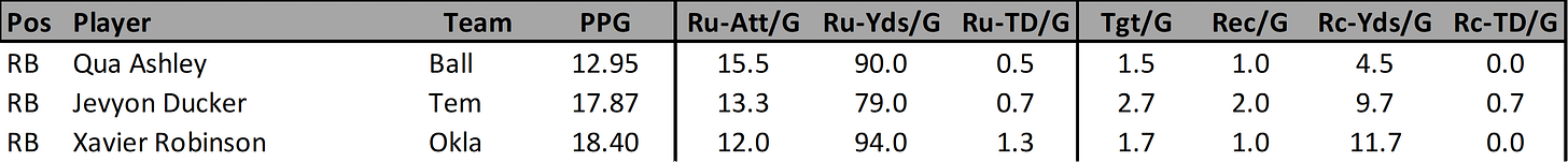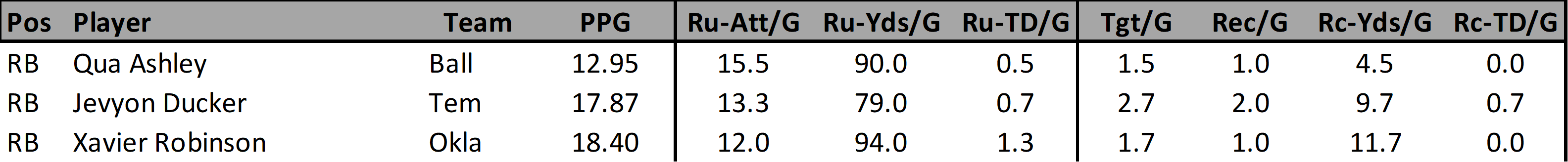 Ashley is coming off of a bye week. In his last game he only accounted for 5 fantasy points so why would I recommend him? He has shown he score produce in the right match ups which he’s done three times this season (scoring 37.7, 17.5, & 20.9 fantasy points in those favorable match ups). With Kent State and Eastern Michigan coming up next he is the best option here for immediate impact on your roster.