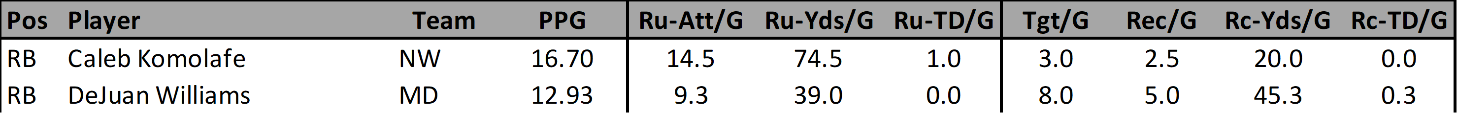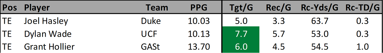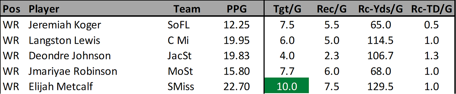 The Missouri State passing game has been pretty decent lately. Robinson is just 0.3 targets/game shy of being considered a volume workload target. I feel like he is a safer option than Lewis and Johnson because of this workload. He scored 19.7, 15.4, & 12.3 fantasy points over his last three games. Robinson is a good high floor option for this week with his match up against Kennesaw State.