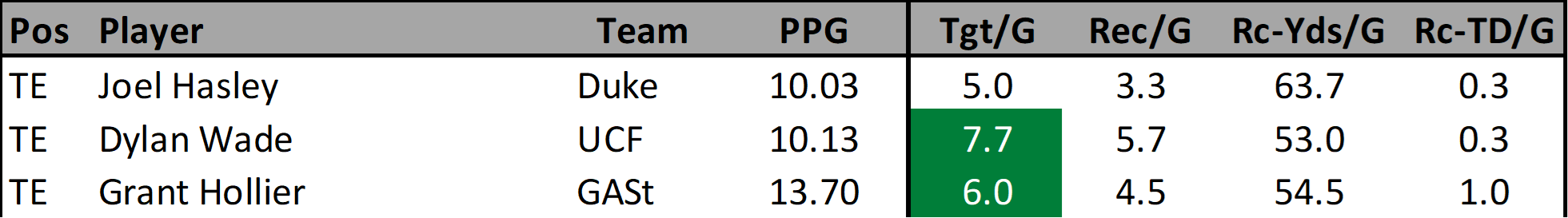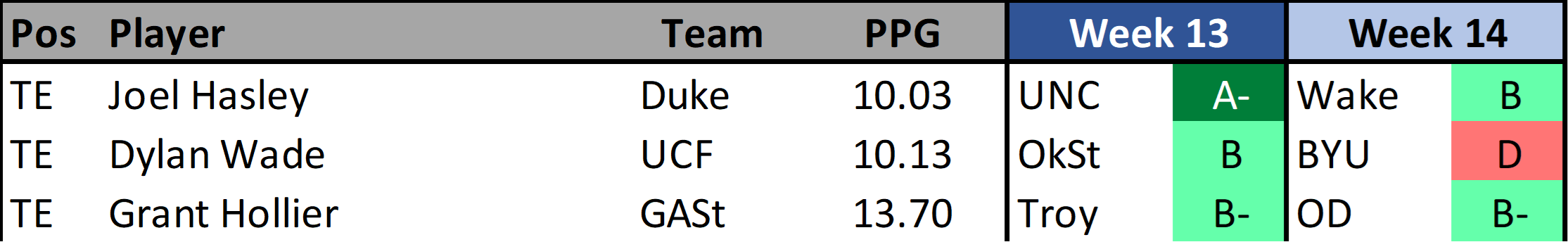 After scoring 9.8 and 14.1 fantasy points at the start of November, Hasley was held to 6.2 fantasy points last week against Virginia. The entire Duke offense was off their game which played a large part in Hasley’s production. I like his match up against North Carolina this week but I have some concerns that the passing match up grade for the Wake Forest match up is a little inflated.