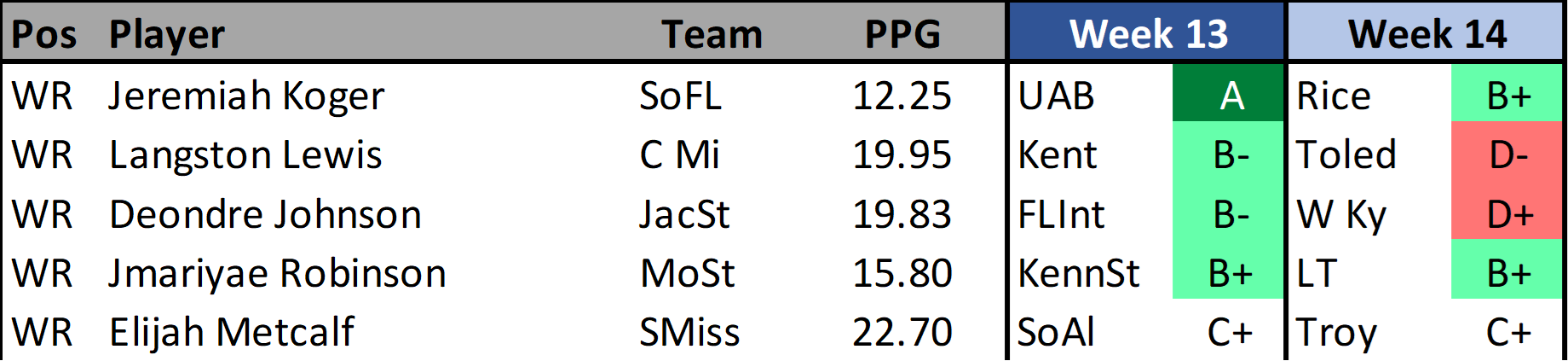 Hollier has been flying under the radar since 10/11. He’s scored 9+ fantasy points and scored a TD in four of his last five games. If you ignore last week’s Marshall game you’ll see he gets between 3-4 targets for 2-3 receptions per game. He can have a pretty good fantasy ceiling but when he doesn’t score a TD and is held to less than 10 yards/reception his floor is very low. If you can stomach the risk to chase high ceiling options (or stash him as a defensive play), then Hollier could be played over the next two weeks.