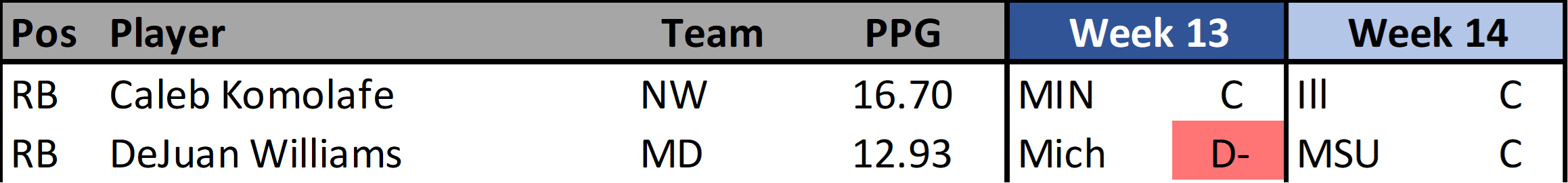 Now the we are in the playoffs your strategy around the waiver wire changes a little. You’ll still need to look for players that can help your roster. I highly recommend using my CFF Schedule Matcher spreadsheet to help ensure that a player helps fill in weeks where you need more help.