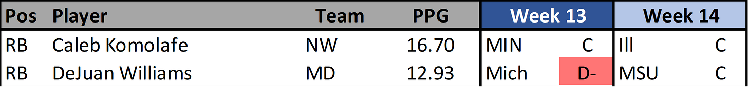 Over the last five games we’ve seen Williams score between 13.3-16.8 fantasy points in four of those contests. His fantasy ceiling is limited but his floor is decent enough to consider for a spot start. While my rushing match up grade for Week 14 is right in the middle with a C, according to Fantrax Michigan State ranks 122nd for giving up fantasy points to RBs.