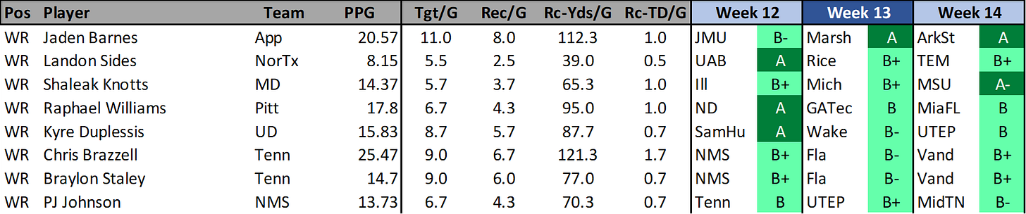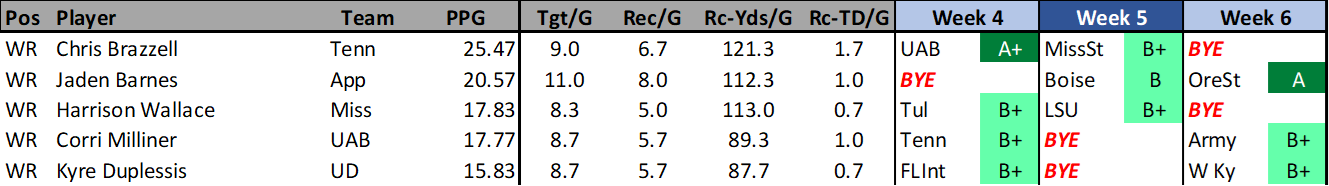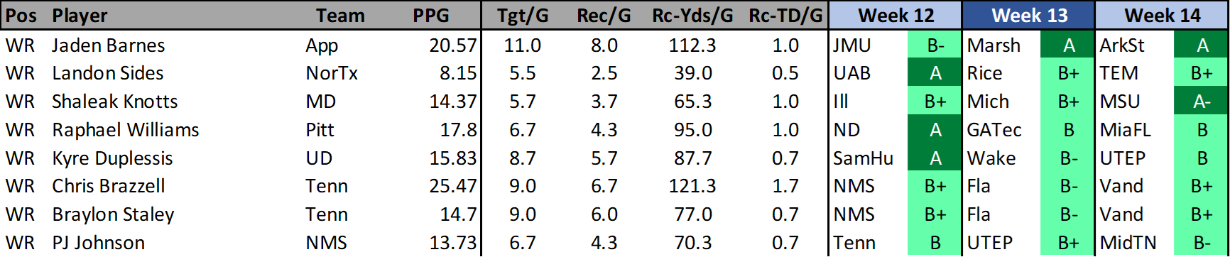 - JADEN BARNES (App): What is there not to like about Barnes? He’s the WR1 for my #19 fantasy passing offense. He averages 11 targets/game. He’s scored a TD in every game (50% of all receiving TDs). He’s got over 130 yards and scored 20+ fantasy points in two out of three games. To top it all off, there’s not one bad match-up on his remaining schedule.