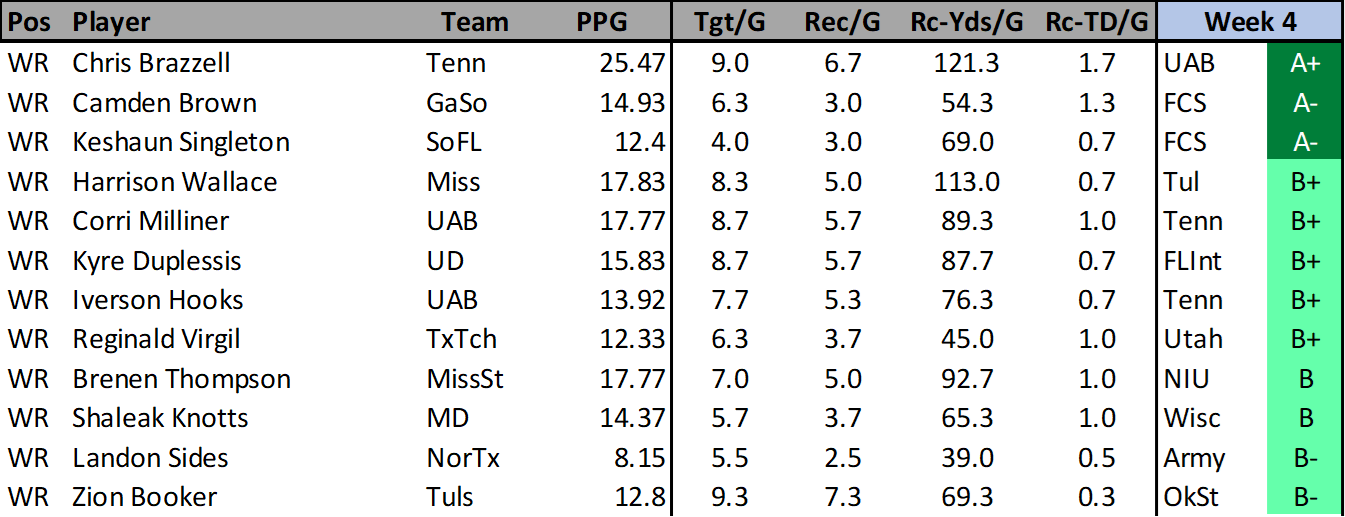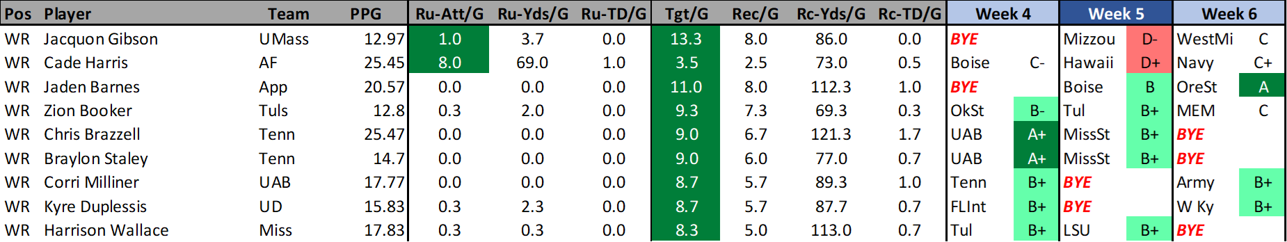 - CORRI MILLINER (UAB): Last week I said I was all-aboard the Milliner train and that remains true this week. Last week he had 9 targets for 6 receptions, 70 yards and 1 TD against Akron. While his targets and yardage fluctuate from week to week, he always finds a way to score (50% of all receiving TDs). This week is probably your last chance to get him before he’s gone for good.