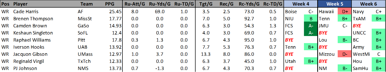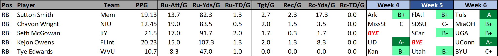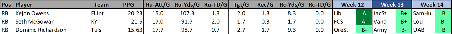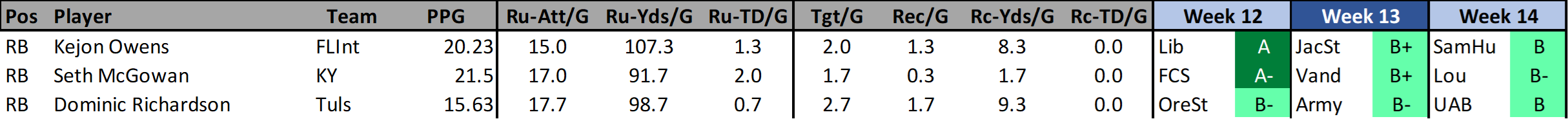 I do like how Owens and McGowan (Top 5 selections) made this list which adds to their fantasy value. Owens might be that guy that helps you win a championship down the stretch. McGowan has good match-ups as well, but I do worry about the Oregon State and Army match-ups for Richardson despite my good grades.