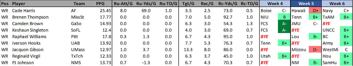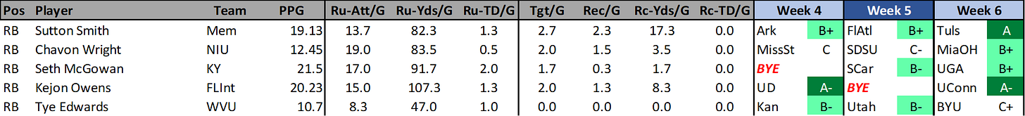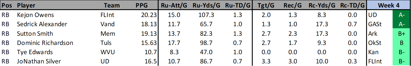 Owens is hands down the best option on this list. I love Alexander’s match-up too, but I have concerns about his light workload and heavy TD production (averaging 13 total touches and 1.67 TDs per game). I’d take Edwards over Smith and Richardson this week since the later two face bigger schools. Silver had a big Week 3 on the ground but I’m not sure that will be the norm.