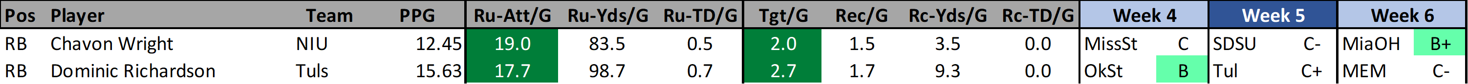 - CHAVON WRIGHT (NIU): Wright’s fantasy production hasn’t been great this season but he still needs to be a priority for the waiver wire. He had 11 carries in Week 1, but was elevated to the start in Week 2 and got 27 carries. Coming off a bye week and having two average fantasy match-ups means that he could still be floating around in your league. As long as you don’t need immediate help at RB I’d recommend stashing him away now for conference play later.