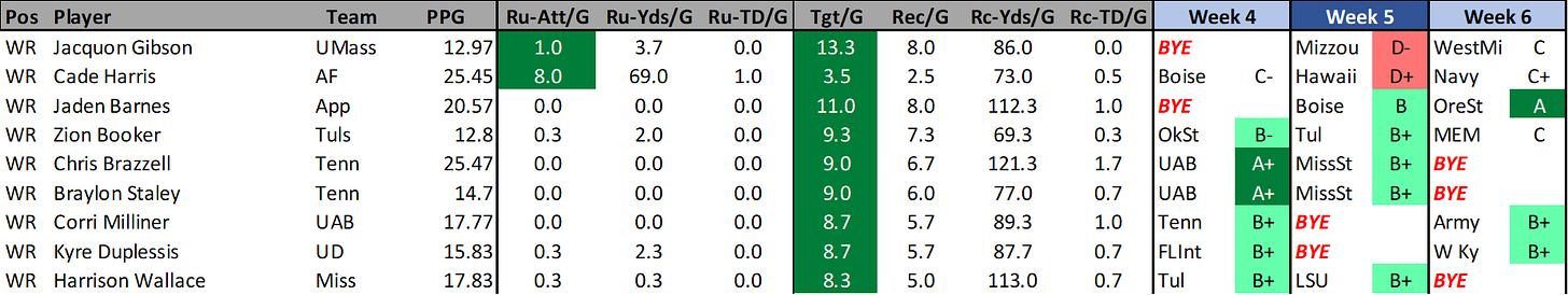 Gibson, Harris, and Barnes reign supreme on this list. Booker has the worst stats of the next thee with Brazzell dominating yardage and TDs. The bottom three options of Milliner, Duplessis, and Wallace are all Top 5 selections that I love this week.