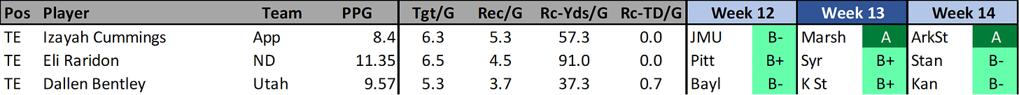 I keep praising Cummings and he tops the playoff match-up list. Considering that Bentley has a nose for the end zone, I like him above Raridon here. Maybe Notre Dame QB CJ Carr find his rhythm as the season goes on and changes that scoreless trend for Raridon.