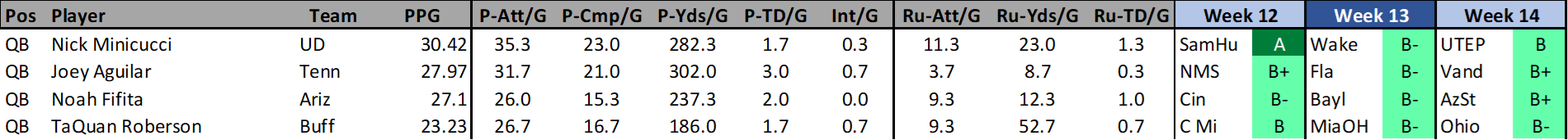 - NICK MINICUCCI (UD): I liked what I saw from Minicucci in Week 1 but that was a rivalry game against an FCS school. Week 2 was an expected setback against Colorado but he came roaring back in Week 3 against UConn. He produced 37.25 fantasy points with 265 yards and 1 TD in the air to go with 20 yards and 3 TDs on the ground. His workload is great with 38 pass attempts and 11.3 rush attempts per game. Delaware is middle of the pack with the rushing game but he is scoring 66.7% of all rushing TDs.