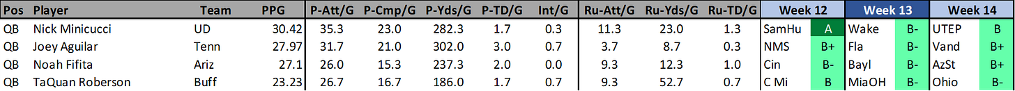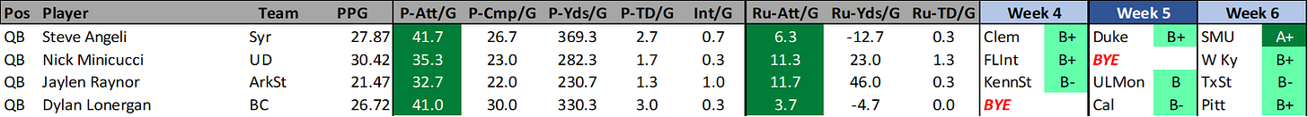 Minicucci and Raynor are the only dual-threat QBs on this list and should be highly looked at. Angeli’s production is high but I don’t think we have a good enough idea of how Syracuse will distribute the scoring opportunities between the passing and running game. In term of volume plays I like Lonergan slightly more than Angeli.