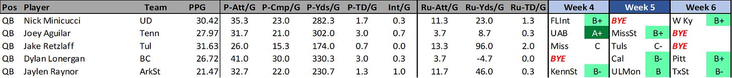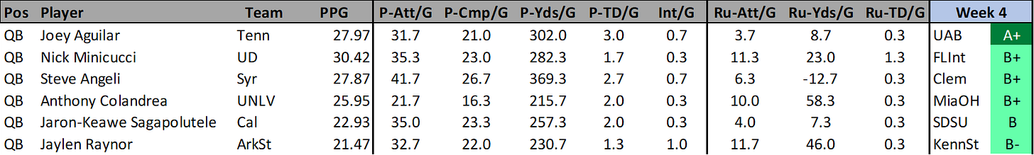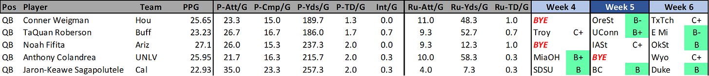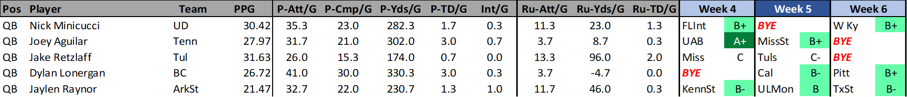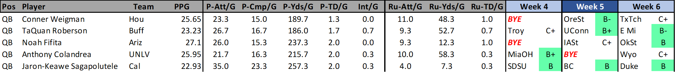 - ANTHONY COLANDREA (UNLV): Coming off of a bye week we still see Colandrea rostered in less than 30% of all Fantrax leagues. He has the best Week 4 match-up of all the honorable mention QBs. He is getting 27.5% of all rushing attempts and accounting for 29% of all rushing yards.