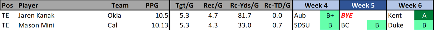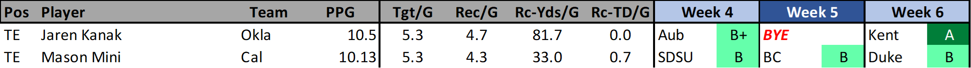 - JAREN KANAK (Okla): Regardless of the quality of opponent Kanak finds a way to put up fantasy points. He has scored between 9.4-12.6 fantasy points in each game despite not finding the endzone yet. He’s not a flashy option but he is a great floor play.