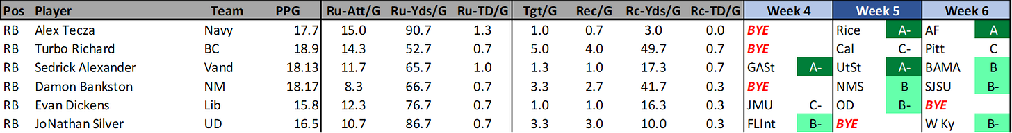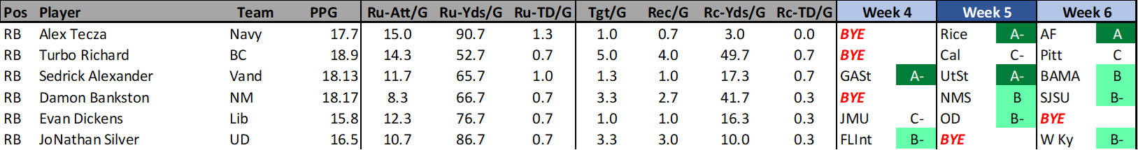 - ALEX TECZA (Navy): Tecza has been the most reliable part of the Navy rushing game. He gets 15 carries every game, scores in every game, and averages 4.8 yards/carry or better every game. His carry share is low at 26.5% but the option offense provides him an advantage with efficiency stats and fantasy production.