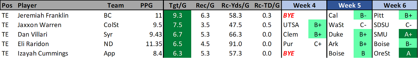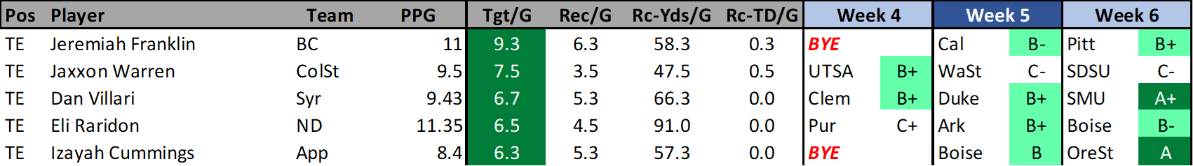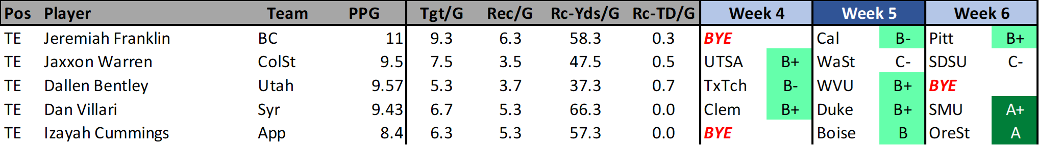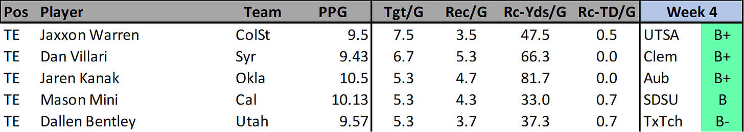 - JAXXON WARREN (ColSt): After an explosive Week 1 performance against Washington Warren was held in check in Week 2 against a FCS team. He was on a bye in Week 3 and I still have faith he will be the leading WR on this team. You don’t find many TEs with the target potential he has which is why he is #2 on this week’s list.