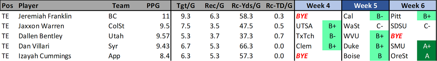 - DALLEN BENTLEY (Utah): Bentley’s stats don’t scream big time fantasy TE. He’s averaging 3.7 receptions and 37.3 yards per game, but he has scored in two of his three games. He’s proving reliability which it hard to find from fantasy TEs.