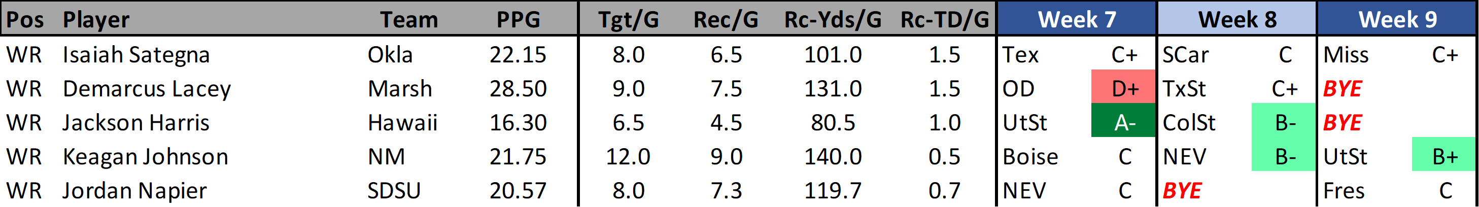 ISIAH SATEGNA (Okla): Sategna first started to emerge in Week 3 against Temple, and in his last two games he has been huge scoring 22.8 and 21.5 fantasy points. What I like is that he has stayed productive despite a QB change occurring last week. The biggest issue with him is that his next three fantasy match-ups are average at best.
