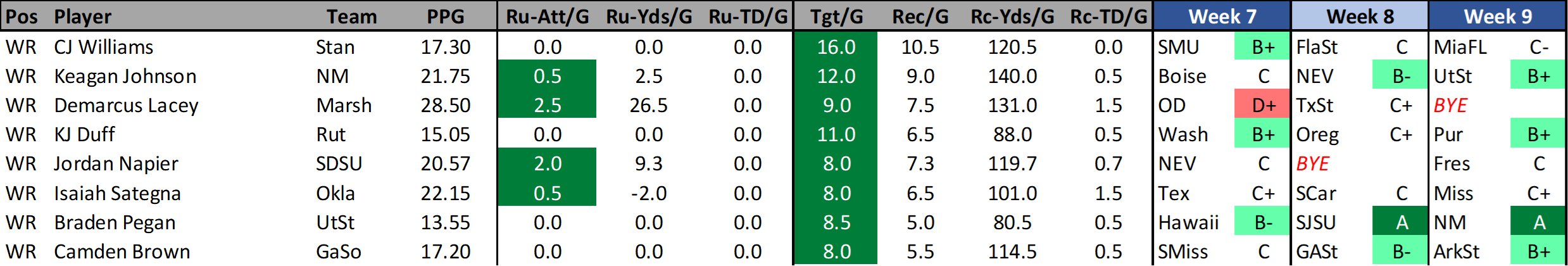Williams stands tall on the top of this list, but he’s the only player to not score a TD over the last three weeks. Johnson and Lacey are tied when you add in their rushing attempts with Duff right behind them. Napier and Sategna are the most reliable of the remaining players with Brown pretty close to them. Pegan should settle back into a fantasy productive guy now that conference play is here.