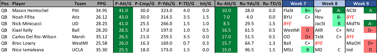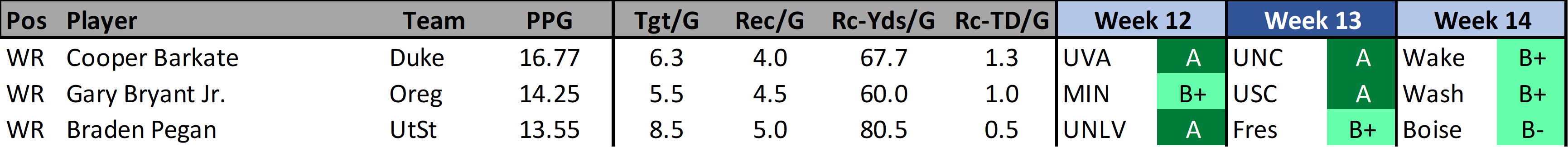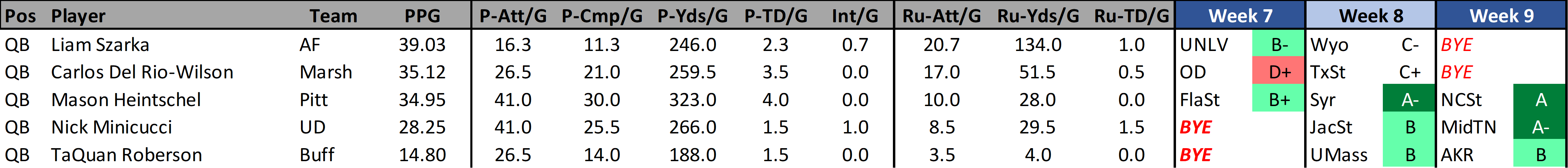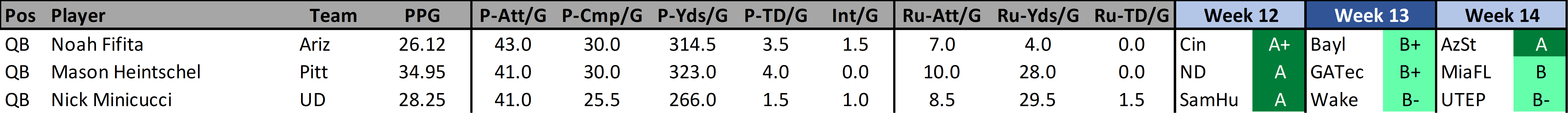 As of right now I would trust Fifita in my playoff starting line-up more than anyone else on this list. Minicucci technically has three good match-up grades but I worry about the Wake Forest game. We will see over the next couple of weeks if Heintschel can be trusted as a playoff starting fantasy QB.