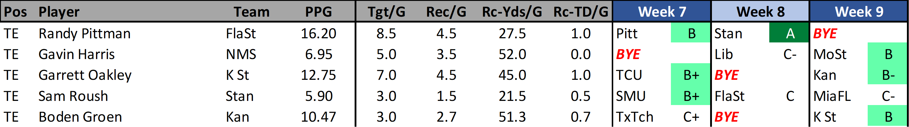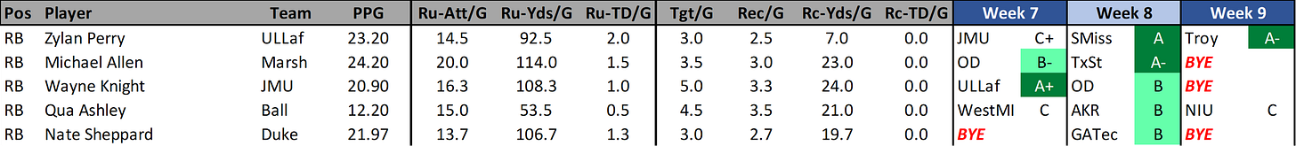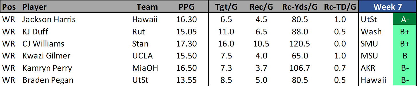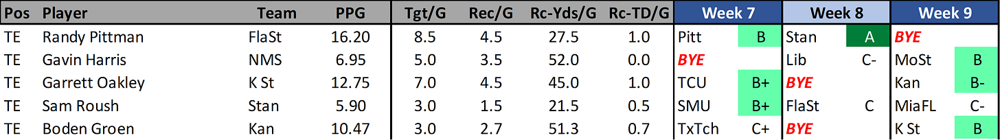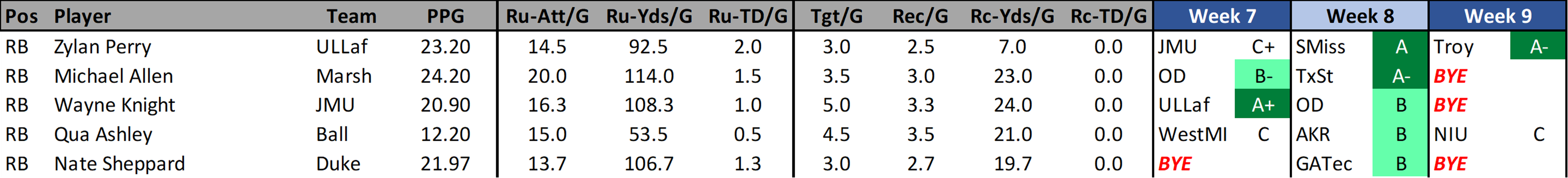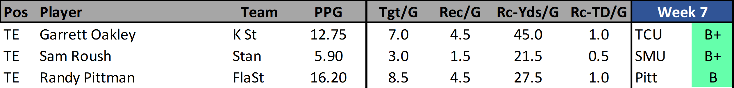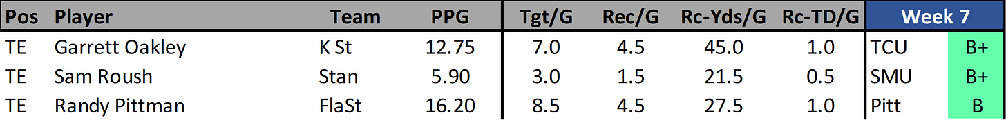 GABRIEL BENYARD (KennSt): I’ve been covering Benyard for weeks now and still see him as a reliable fantasy asset. He has scored 13+ fantasy points in 5/6 games, and he’s had 5+ receptions and scored a TD in 3/5 games. I also like that he is scoring 60% of all receiving TDs for the Owls.