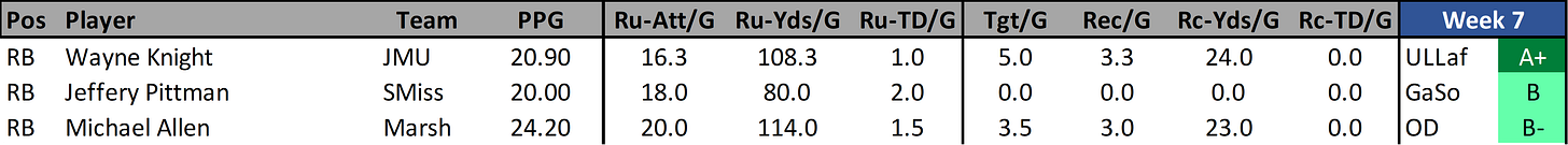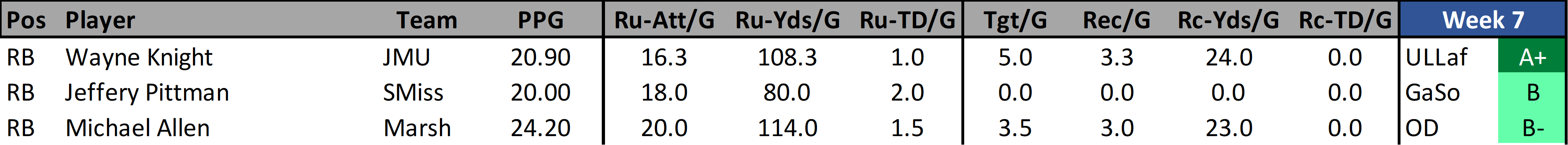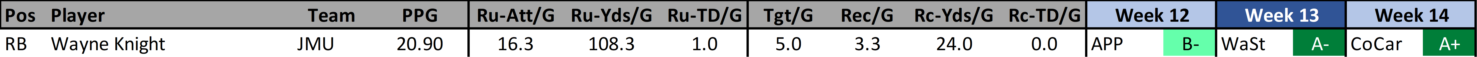 WAYNE KNIGHT (JMU): Knight has emerged as the RB1 for James Madison. He has scored 17+ fantasy points in his last three games (26.6 fantasy points once), and he’s rushed for 85+ yards and 1 TD in his last three games as well. He does bring some PPR value to the table, with 15 targets for 10 receptions and 72 yards during those last three games.