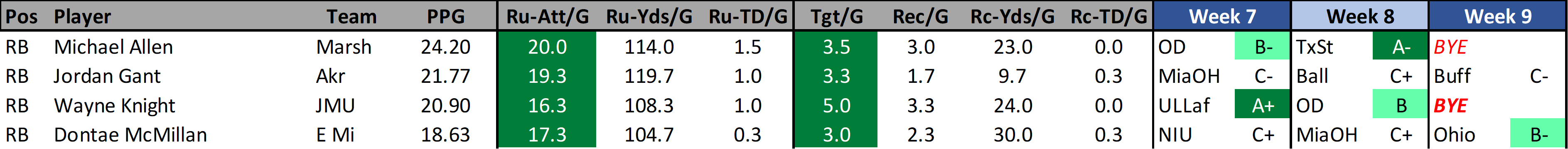 JORDAN GANT (Akr): I’m not quiet sold on Gant yet but wanted to cover him. Last week against Central Michigan he carried the ball 32 times for 176 yards, had 3 receptions for 28 yards and 1 receiving TD. That was the only time this season he’s hit 14+ carries in a game. Three weeks ago against an FCS school he had 13 carries for 161 yards and 3 rushing TDs. I' don’t know how the coaches will handle his workload moving forward and its possible he goes back to 13 carries or less per game.