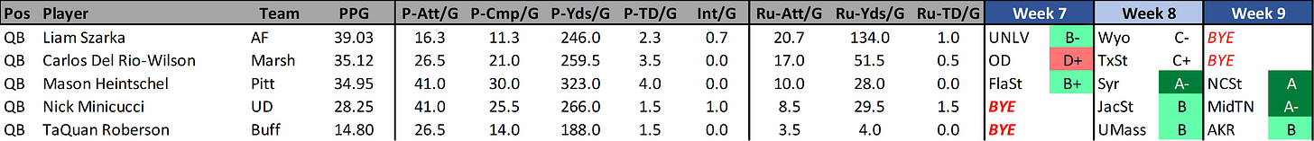 LIAM SZARKA (AF): Its now been three weeks in a row that Szarka has put up big numbers scoring 25.5, 37.8, & 43.8 fantasy points. The passing game has been opened up over that span and he’s thrown for 200+ yards and 2 TDs in each of those games. He’s also taking care of business on the ground with 30.9% of all rushing attempts, 36.6 % of all rushing yards, and 40% of all rushing TDs.
