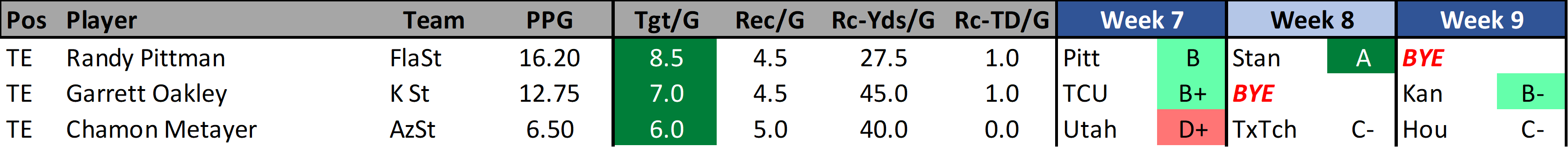 Pittman’s workload volume is the best of this group, but he is the least efficient with those receptions when it comes to yardage production. Oakley gives the best mix of workload, yardage, and scoring potential of this group. Metayer still has his nice workload but just can’t seem to find the end zone.