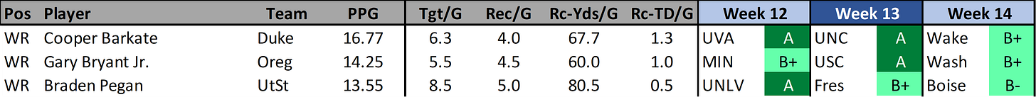 COOPER BARKATE (Duke): The things I like about Barkate is that he has scored 14, 21.2, & 15.1 fantasy points over the last three games, and he’s scored a TD in each of the last three games. What I don’t like about him is that he’s never had more than 5 receptions in a game, he’s only reached 80 receiving yards in a game once, and he has two byes over the next three weeks.