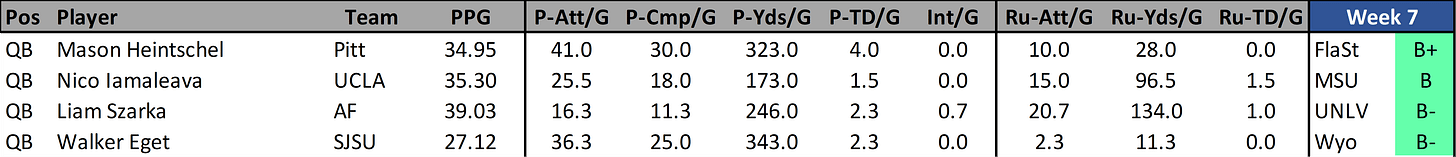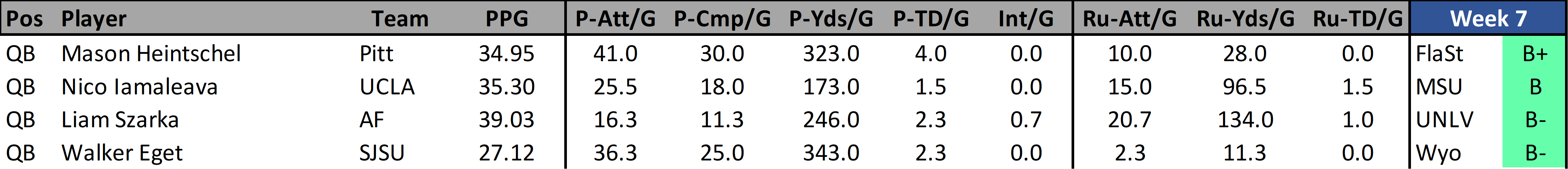 As I look at this group I feel like the best option is probably to keep riding the hot hand of Szarka. His match-up with Navy last week was worse than what we see with UNLV. I mentioned that I’m not sure I trust Heintschel this week against Florida State so that would push Iamaleava up to the #2 recommendation for this week. Eget would round out my top three here.