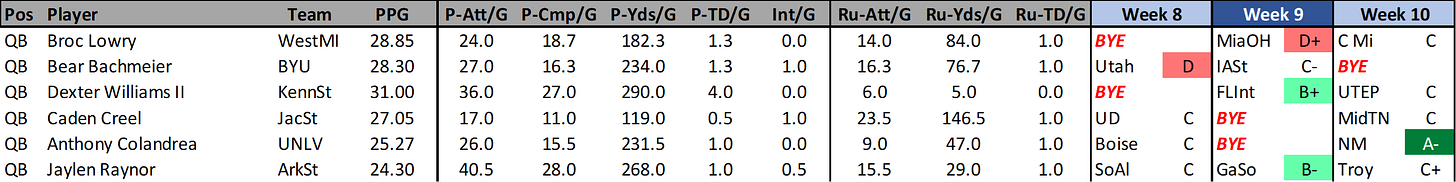 CADEN CREEL (JacSt): Jacksonville State’s starting QB has been injured and Creel has stepped up twice now scoring 29.55 and 24.55 fantasy points. He’s been a good fit for this rushing offense, and he has run for more yards than he’s passed for in both of his starts. The fantasy match-up grades in the chart above are based on passing. When you look at the rushing match-ups for the rest of the schedule 5/6 of the remaining games have an A grade with the worse match up being a B+.
