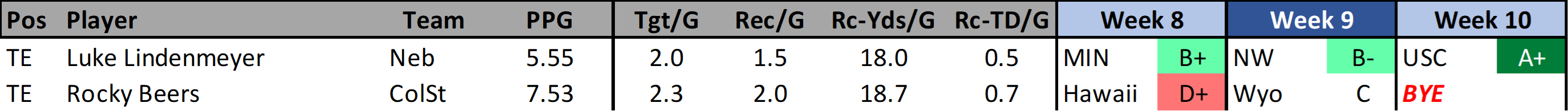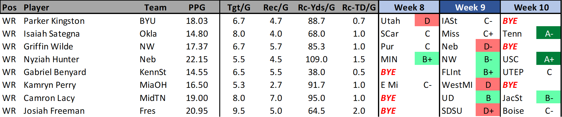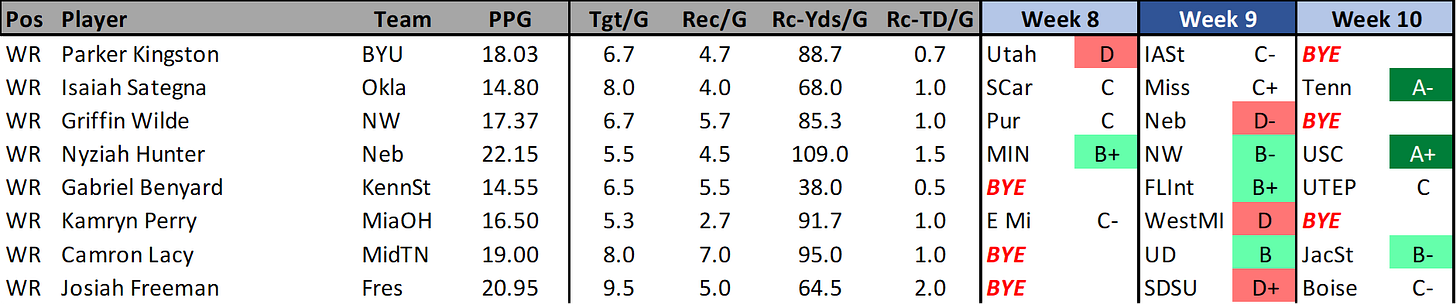 GRIFFIN WILDE (NW): Wilde has been pretty reliable over the past three games scoring 19.3, 13.9, & 18.9 fantasy points. He has 20 targets for 17 receptions, 256 yards and 3 TDs over these games. Those games were against UCLA (before the turnaround), UL-Monroe, and a terrible playing Penn State. The upcoming schedule is a detriment though.