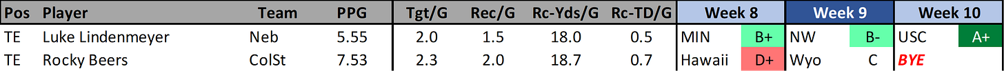 ROCKY BEERS (ColSt): Beers has been filling in for the injured Jaxxon Warren. On 9/20 he scored 11.8 fantasy points, then had two stinker games before last week. Against Fresno State last week he scored 16.1 fantasy points. He is totaly TD dependent as he gets 4 or less receptions and had not racked up 40 yards in a game yet.
