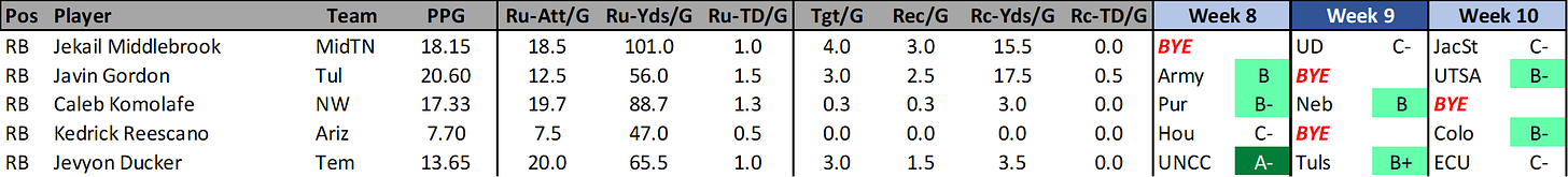 JEVYON DUCKER (Tem): Ducker has been inconsistent this season. He puts up decent fantasy numbers one week, then scores around 4 fantasy points the next week. Over the last 5 games, when he has been decent he has scored 14.77, 15.6, & 22.6 fantasy points. I do like that he has gotten 14, 16, & 24 carries in the last three games.