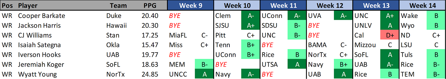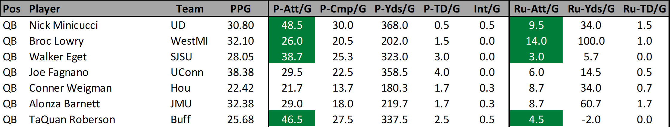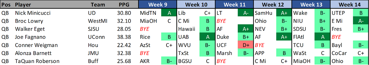 Fagnano has been RED HOT the last two weeks scoring 34.15 and 42.6 fantasy points. He’s only managed to break 20 fantasy points one other time against FBS opponents though, and my worry that this could be a temporary hot streak is the main reason I pushed him down my list despite the fact he has a very good schedule match ups still remaining.