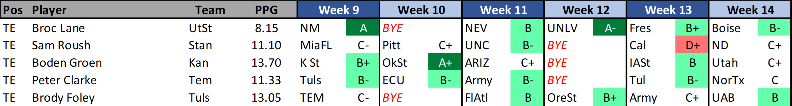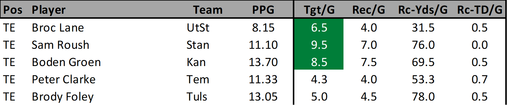 I’m not sure how much I would want to rely on the Tulsa offense right now but I recognize that Foley has been producing. In the last four games Tulsa has only score 20+ points once. In those same games Foley has scored 9.1, 13.7, 4.5, & 21.6 fantasy points while finding the end zone in half those contests. While there are some average fantasy match ups remaining on the schedule non of these teams present a daunting challenge.