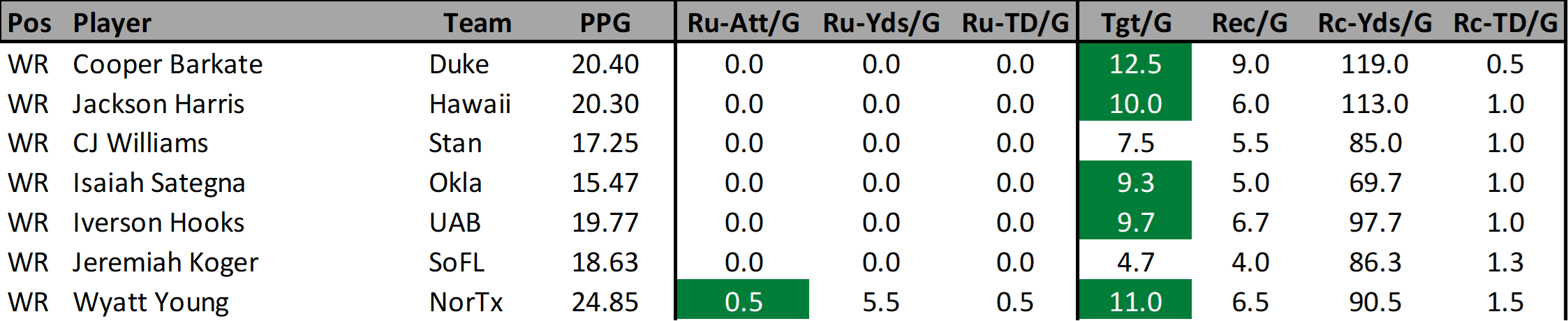 With the inconsistent nature of the Florida Atlantic offense this season, I’m not sure if Kirch can continue his current production. If you ignore the UAB game (he didn’t have one target) his last two games have produced 22.2 and 11.1 fantasy points. Before these games he had scored just 2.8, 1.3, & 1.2 fantasy points. You can’t ignore how juicy his remaining schedule is though.