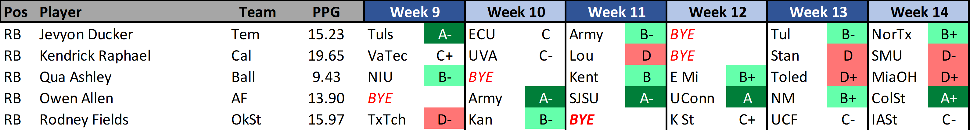 Hellums took control of the starting job at the start of October has has played fairly well. He’s put in three straight 28+ fantasy point performances. Its surprising that he isn’t getting a high volume workload like most option offense QBs get. Its unfortunate that he has two bye weeks coming up but all his match ups shown (rushing match up grades) are very good.